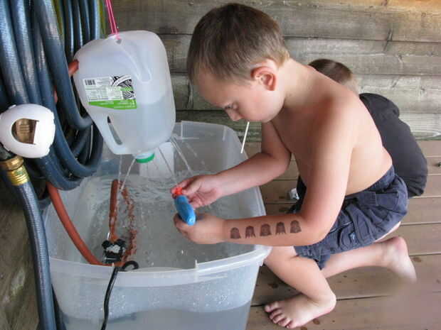 Usted los puede llenar en un fregadero, pero eso no es una gran opción cuando tienes diez niños que prefiere no tener corriendo por tu casa. Puedo rellena las cajas con la manguera, pero sólo porque yo puedo apretar la boquilla jardín sólo un pelo para permitir un pequeño chorrito de agua hacia fuera. (Mi hijo no puede.) Pensé acerca del uso de una jeringa pequeña, pero estaba seguro sería capaces de funcione y mantenga la pistola a la vez, y no pude encontrar uno de todos modos. Así que necesitaba alguna forma de hacer uno o más flujos de delgado de agua justo en los orificios de las pistolas de chorro.