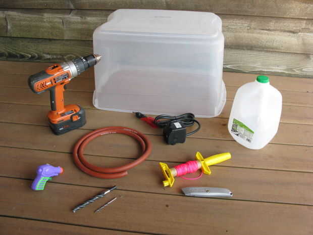 Taladro y brocas - usted podría ser capaz de conseguir por sólo empujando los agujeros en el envase, pero creo que las corrientes de agua limpia si realmente Taladre los orificios. Usé una 1/2" para los dos agujeros superiores para colgar, y un 1/8" broca para los orificios de drenaje.
