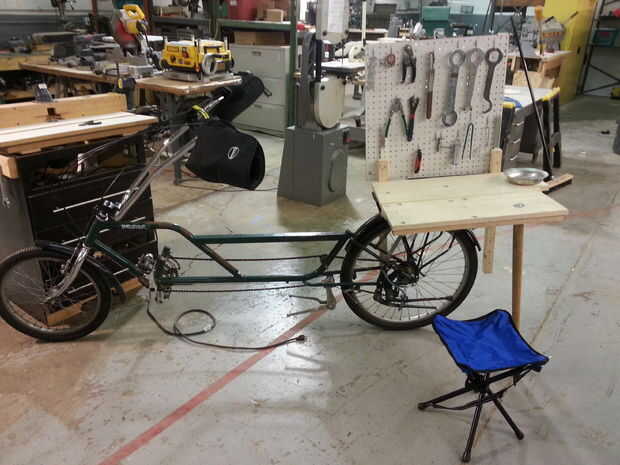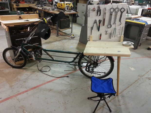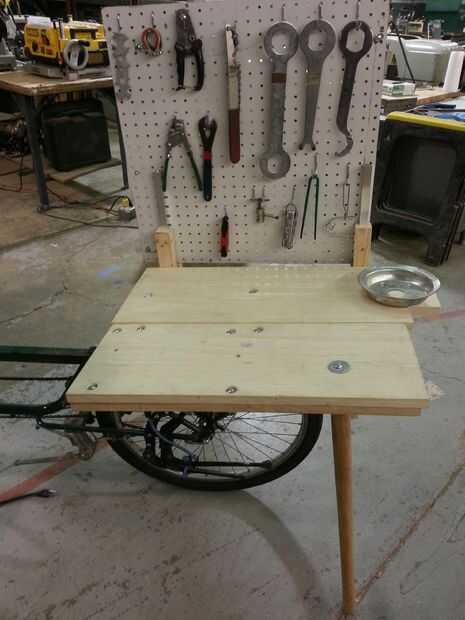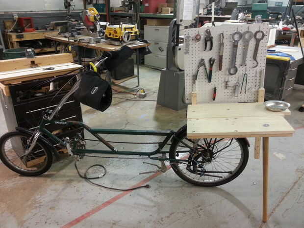 En este instructable, mostraré cómo construir una estación de reparación de la impresionante bicicleta portátil. Imagina una tienda entera en el bastidor trasero de su bicicleta! Puede tomar esta estación de reparación portátil a festivales, en ciclovías o donde irá la bicicleta, usando para negocios o propósitos de la manía. Conseguí esta idea de un mecánico que arrastra alrededor de un remolque lleno de herramientas de bicicleta. Creo que este diseño es una alternativa más fácil y más funcional para llevar herramientas en una caja de herramientas y luego tener que buscar una superficie de trabajo. Este es mi primer proyecto de trabajo de madera así que por favor me da respuesta :)