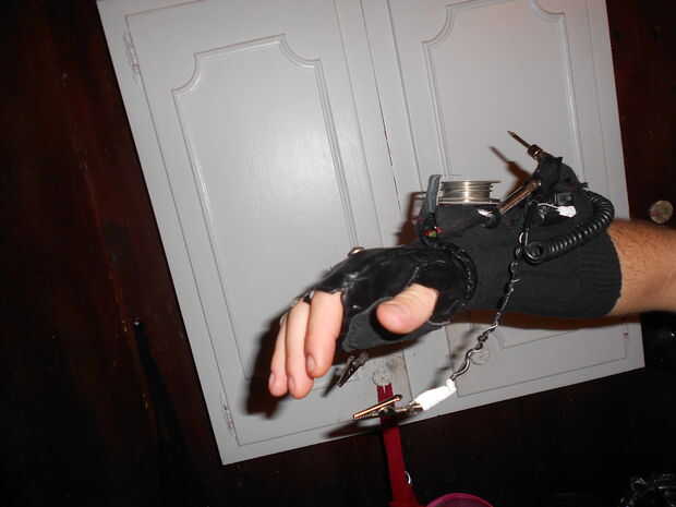 este proyecto es un básicamente un guante de manga montada inalámbrica estación de soldadura construido con materiales reutilizados en su mayoría. Tiene dos "manos", una linterna, soldador, un sostenedor magnético de la bobina soldadura y sale corriendo algún viejo ordenador portátil de baterías. Montado en un calcetín cosido a un guante que había perdido la izquierda y utiliza las cintas elásticas de un par roto de tirantes. Ahora soy carga de las baterías de un AC adaptador de pared pero actualmente estoy trabajando en cargador solar para ella y mis otras herramientas eléctricas.