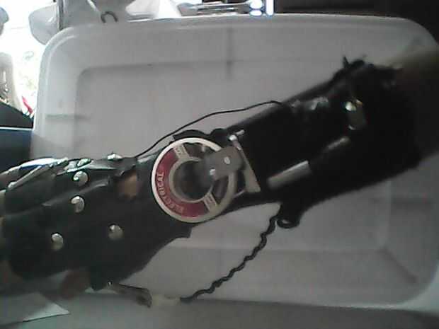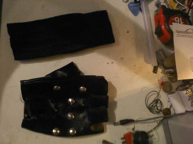 Para este paso solo cosí el guante sin dedos para el calcetín para hacer básicamente un guante largo y luego coloca la estación de soldadura donde quería y une las piezas de correa elástica de un antiguo conjunto de tirantes para deslizar la estación a y asegúrela. Este también es el paso donde he añadido la bobina para sostener el rollo de soldadura. Como se puede ver en las fotos, doblará en forma para sostener el rollo de soldadura por lo que puede girar sin caerse cuando su boca abajo. Entonces me deslicé esta pieza debajo de la cinta elástica en la parte superior el imán desde el disco duro, como se muestra en las siguientes imágenes.