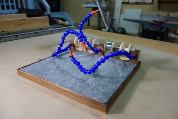 He estado utilizando esta pieza de pizarra como un área de trabajo de soldadura y otros trabajos en caliente. Hace un gran trabajo de proteger las superficies de madera de las quemaduras, pero era muy fácil de rayar la superficie del. Pizarra no es la piedra más durable y es propenso a la fractura si golpearlo alrededor. Construir esta estación de soldadura para la mayoría todo lo que necesito es todo en un solo punto mientras que más protege la superficie de su sobre y la pizarra de sí mismo. Todas las piezas necesitan pueden encontrarse en Amazon.com y te proporciono links abajo. El diseño puede ser modificado fácilmente para satisfacer sus necesidades y sin duda no necesita un router CNC para cortar los agujeros.