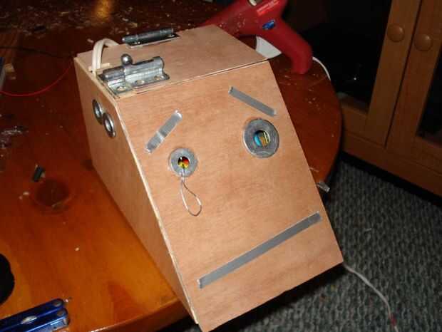 Oh, y me di cuenta de esto parecía muy similar al robot de Instructables; fue pura coincidencia cómo funcionó el tamaño del ojo. Le dio un rostro de cinta de conducto temporal, pero podría hacerlo permanente con alguna pintura (y un cuerpo amarillo).