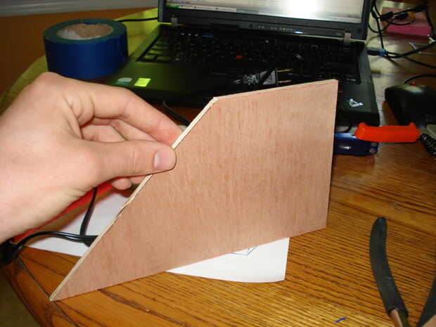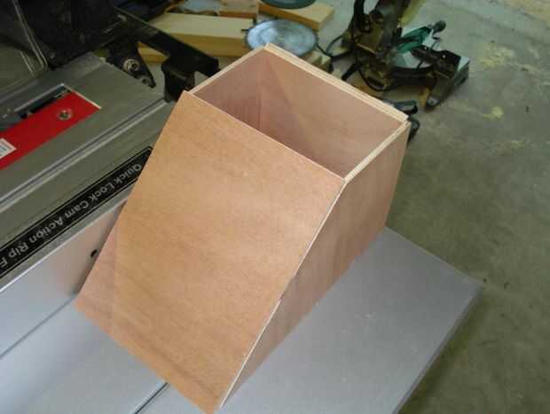 La primera imagen muestra uno de los dos lados de la caja. El panel de aproximadamente 5" alto, 9" de largo con un ángulo de 45 grados corte como se muestra. Elegí esta inclinación debido a fue fácil trabajar con un ángulo bastante cómodo en el que se vuelva a colocar el soldador. Supongo que un ángulo menor habría sido más natural para mí, pero que habría disminuido la capacidad de almacenamiento de la caja... inaceptable.