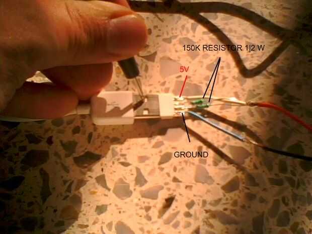 Tomé un conector macho usb, puso tierra de resistencia - resistencia de 150 k - 5v - cable rojo - 150 k