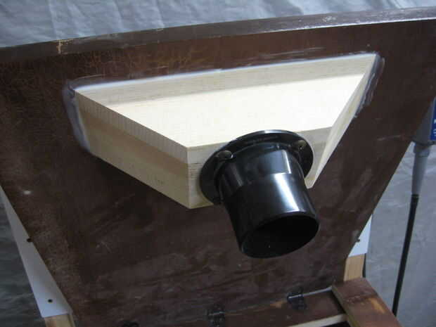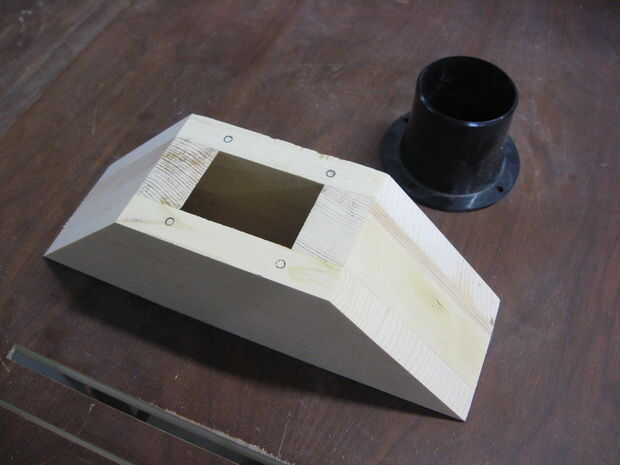 Una caja de madera simple, cónica fue creada para este propósito de algunos pinos de chatarra. El adaptador de plástico fue sujetado a esta con los tornillos y un anillo de adhesivo para hacer un buen sello.