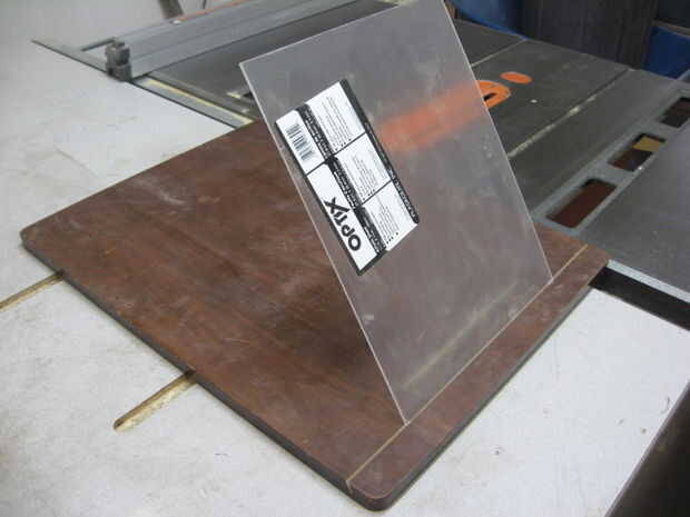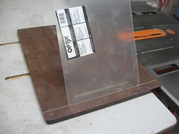 Se hace de un 11" por 14" pieza de acrílico que descansa en un surco cortado en el borde frontal de la pieza superior. El corte es de 3/8" de profundidad y se realizó en la Sierra de mesa con la hoja a unos 25 grados.