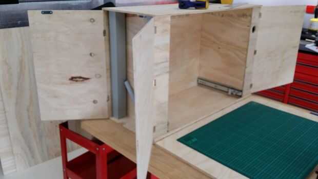 Colocar puertas con bisagras de cobre amarillo muy pequeño y calibre de 4 pequeños recolectores del avellanado. Yo había planeado originalmente para utilizar bisagra del piano pero el capas de fina 7mm hecho introducirlo sin un montón de muy difícil modificación.