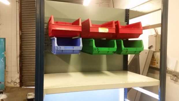 El estante superior es donde normalmente sería almacenar equipo ocasional, tuve algunos contenedores de piezas y portador de un montaje que hice en la tienda un par de años atrás y este cabe en bien, dejé algún espacio por debajo para el equipo como usted verá en un paso más adelante, sé que esto parece alto pero estoy 6' 3" por lo que puedo llegar a , si eres menor por favor tenga acceso en mente.