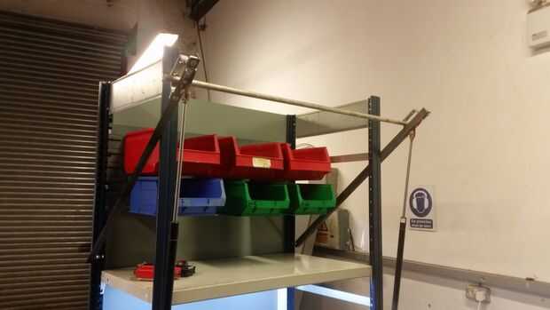 La solución fue montar el portador en un brazo que hace pivotar y uso algunos carneros de elevación gas viejo que tuve que aguantar todo el lote de la vía, cuando tenga que cambiar los carretes de que puedo saco el carril de abajo, introduzca un pin para mantenerla en la posición inferior, trabajar con seguridad en la barra y luego déjela levantar detrás.