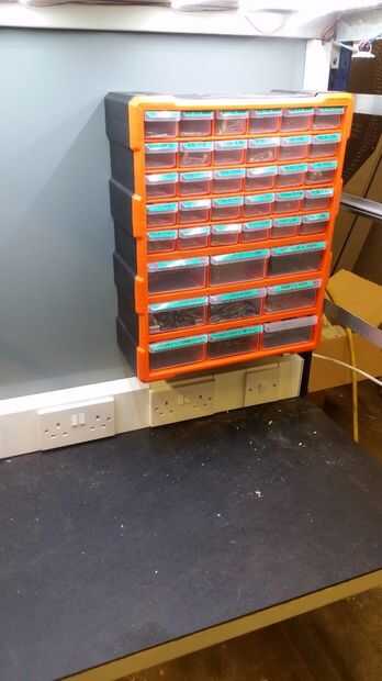 Había montado mi contenedores de componentes a la pared posterior, cuidadosamente he separado todos los componentes en sus cajones y etiquetados para arriba, no hay punto en tratar de recordar los códigos de color del resistor o buscar un LED cuando estás en pleno vuelo en la construcción.
