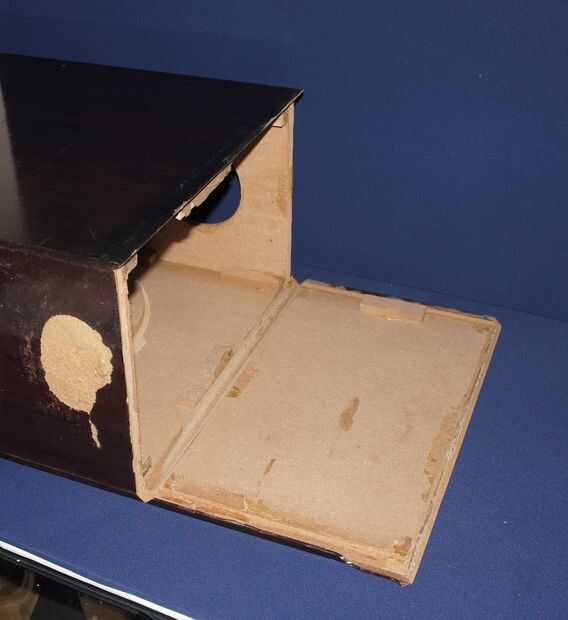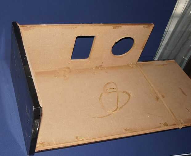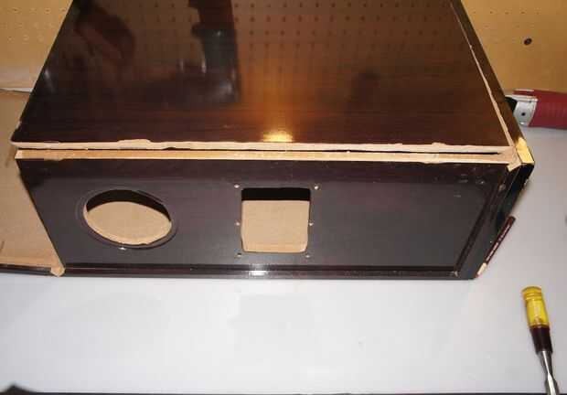 - Poner el altavoz en su lado derecho, frente a usted, separar la Junta directamente en frente (uno con los agujeros del altavoz) y el tablero superior del resto del altavoz, asegúrese de dejar intacta la esquina. Debe ser en forma de L y servirá como la parte superior del Banco.