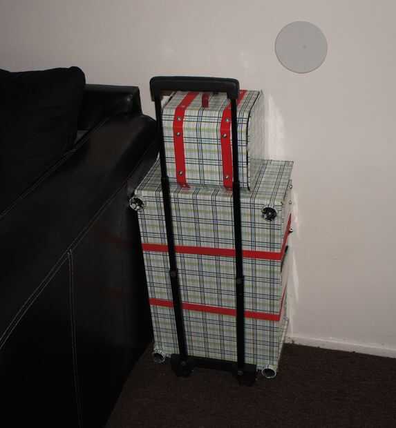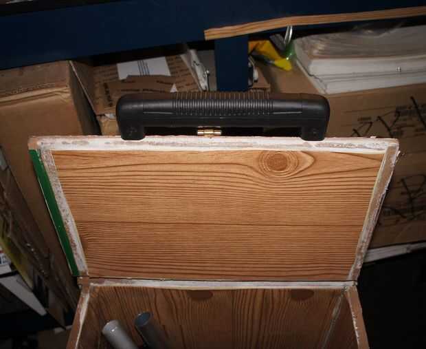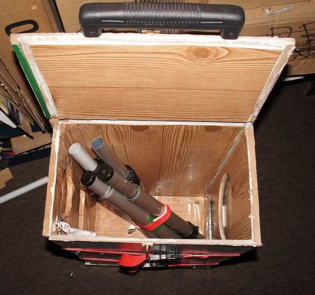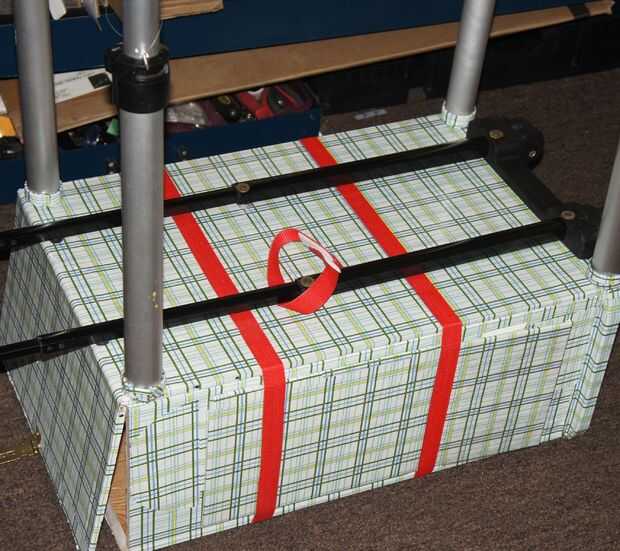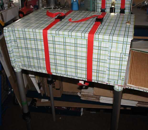 Este es el producto final. Usted puede elegir dejar la caja de herramientas libremente sentarse en la mesa de trabajo, pero añadí velcro en la parte inferior y mandos para evitar que se deslice alrededor o caerse. También puede simplemente tirar las piernas en el caso del Banco, pero odiaba la idea de la cubierta gettting arruinado o las lámparas de ser pilladas, usé izquierda sobre las correas de las hebillas y algunos velcro para minimizar el daño.