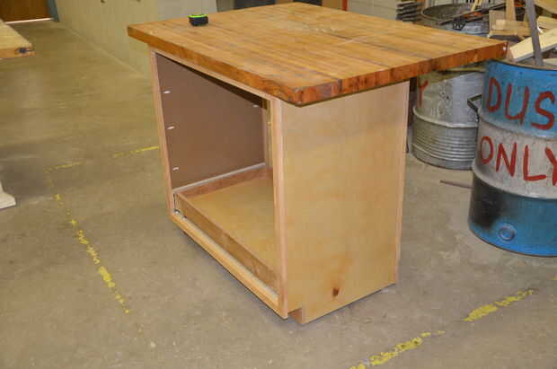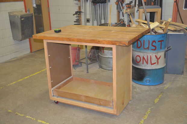La mesa es algo que compró a un vecino para $40 hace unos años. La parte superior estaba en buena forma, pero la base era solamente una base con ninguÌ n almacenaje etc.. Medidas 38" profundo, 54" de ancho y 2" de espesor y se compone de tiras pegadas encima de roble blanco. La cosa es pesada pero lo suficientemente fuerte para tomar abuso más que probablemente nunca se lanzo en él. Sé que no podía haber construido un top como este para $40 de materiales.