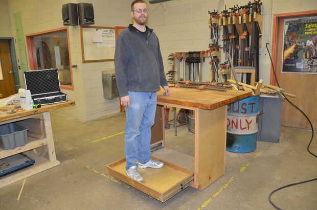 Ojos penetrantes notará que hay una barra de pinzas en la parte posterior de la tabla como estoy parado en el cajón. Éstos solamente cerca de 20 libras de peso pero fueron suficientes para mantener el gabinete estable con mi 200 libras en él. Mi torno pesa considerablemente más.