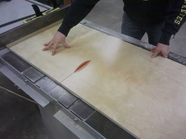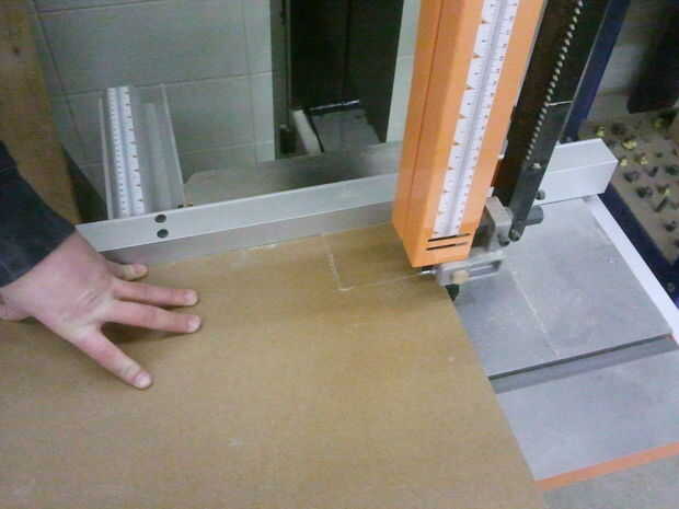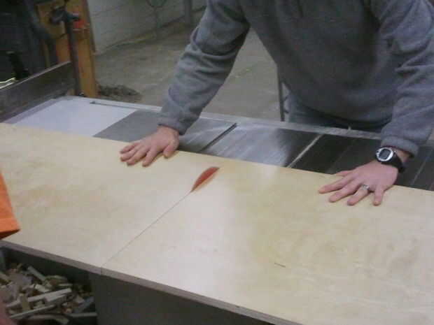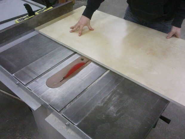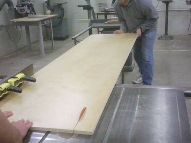Al hacer un mueble, normalmente el primer paso es cortar una hoja entera de madera longitudinalmente con la anchura que usted necesita. En mi caso hice 22". Tienes a la izquierda sobre la tira en el centro de la hoja entera a utilizar para las tiras de tornillo para armar su caso. Juegos extras de las manos o algún tipo de tabla de avance de salida tienden a ser muy útil.