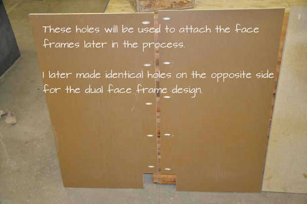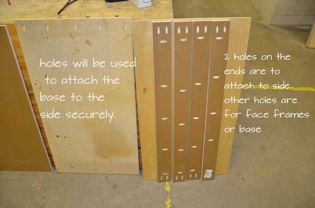 Cada una de sus tiras de tornillo conseguirá varios agujeros de ocultación. Dos en cada extremo (para atornillar a los lados del armario y 3-5 a través de una cara larga para fijar ajuste más adelante.
