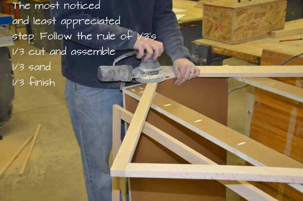 Mejor que hacer su sujeción y atornillar, menos tendrás que cosas de la arena. Este es el tiempo que necesita para equilibrar cualquier pequeña imperfección en su marco. Asegúrese de que usted lijar todas las superficies para eliminar marcas de sierra/quemaduras, charla de cepillo (marcas del cuchillo) y pedazo a pedazo desnivel. Este es el paso que se dará cuenta de todo el mundo. Puede ocultar un montón de males con un buen trabajo de arena.