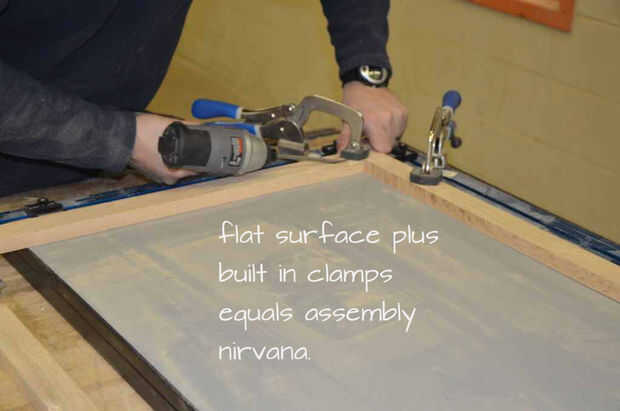 Al montar los marcos de la cara es muy útil hacerlo en como plana de una superficie como sea posible. También es agradable cuando usted puede sujetarse directamente a esta superficie. Herramienta Kreg tiene tal superficie. (Me debo realmente pagan toda esta publicidad gratuita, pero sus cosas son realmente bastante rematadamente buenas)