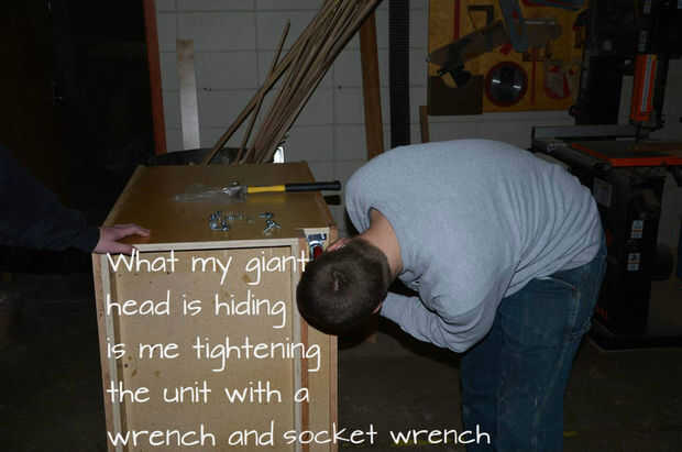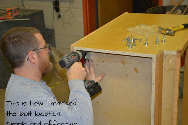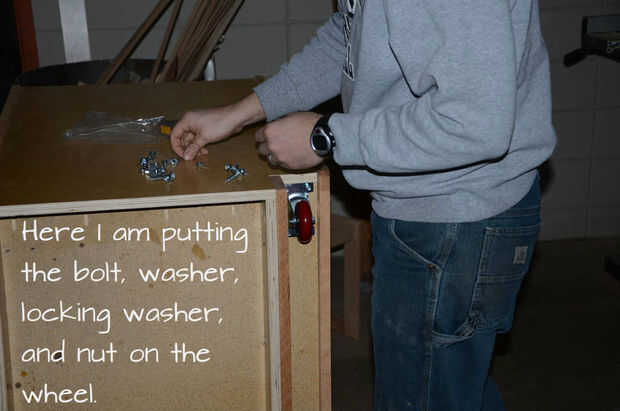 Para unir las ruedas me mantiene en su lugar y había marcado la ubicación de los agujeros con la broca. Una vez que se marcaron los 4 orificios perforaron a través de todo el camino. Luego se deslizó washered pernos a través del gabinete, resbaló en el volante, arandelas de bloqueo y nutted el conjunto juntos.