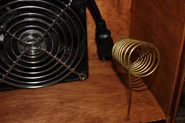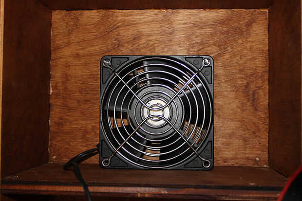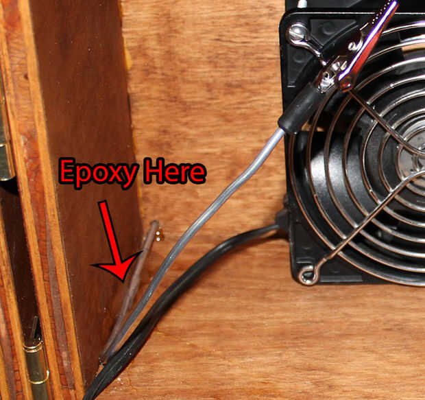 Para hacer los soportes de alambre tome su cable de armadura y un extremo de epoxy en los cocodrilos. Tome el otro extremo y pegar en la esquina trasera de la caja (ver fotos). Hice un pequeño agujero para los cables que están anclados en la madera. Yo entonces doblar el alambre de la armadura para que los cocodrilos eran directamente en frente del ventilador. El alambre de la armadura en las esquinas para dar luego un poco más rigidez de epoxy.