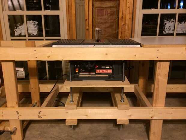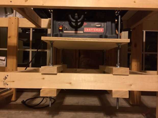 La plataforma elevadora es simplemente un pedazo de 3/4" madera contrachapada 19 1/2" x 24" para las herramientas superior de banco para sentarse. Utiliza cuatro varillas 1/2" roscado fijos a la estación de trabajo a través de agujeros de 1/2" en 2 "x 4" s. tuercas y arandelas de bloqueo el 2"x 4" s al riel inferior y eleve la plataforma para hacer la parte superior de la herramienta integrada en los paneles de apoyo. Perforar cada uno de los dos conjuntos de 2 "x 4" s juntos para asegurarse de que los orificios estén alineados perfectamente. Los agujeros en la plataforma de madera contrachapada se encuentran los orificios correspondientes de 2 "x 4" por debajo de ella pero son perforados 3/4" para permitir jugar un poco. La plataforma se basa en cuatro 1/2" arandelas de apoyo de palomillas justo debajo de ellos. Aflojando las tuercas de mariposa en la parte inferior se puede mover la plataforma entera a la izquierda, derecha o centro en la estación de trabajo para permitir que la longitud de la obra pieza ser apoyado. Ser cuidadoso para asegurarse de que la plataforma es lo suficientemente grande como para apoyar la huella de las herramientas más grandes, en algunos casos puede ser un ajuste apretado.
