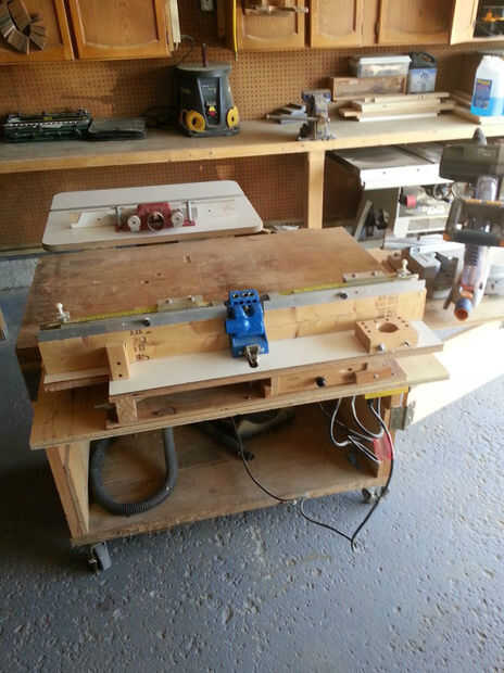 Se trata de una mesita de estación de trabajo que hice en mi garaje para ahorrar algo de espacio. Un lado tiene un inglete vio otro lado tiene un juego kreg jig de agujero de bolsillo y el tercer lado tiene una mesa de fresadora, que baje y me permite hacer esta tabla bajo el mostrador al lado de mi garaje.