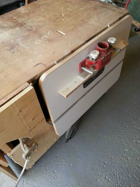 El accesorio de mesa de router es básicamente la misma como el accesorio de sierra, donde está articulada en la parte posterior de la mesa y cuando se levantó, otra junta con bisagras se saca para apoyar la mesa de fresadora.