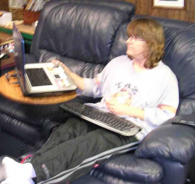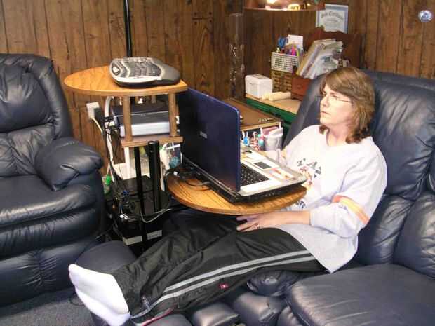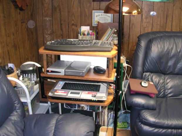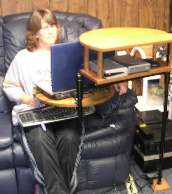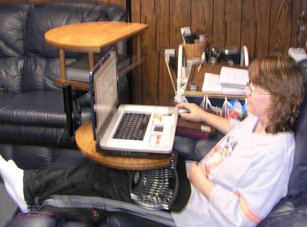 I ha tenido detrás y problemas del hombro durante años (tienen un reemplazo articular de hombro) y encontrado hace muchos años que trabajo en una posición semi-reclinada mantuvo mis músculos de endurecimiento. He tenido varios escritorios personalizados, modificaciones de la silla, etc. sobre los años, pero nunca algo tan cool como lo tengo ahora. Mi esposo construyó así he ir a conseguir las instrucciones de él, pero por ahora puedes ver lo versátil es. Puedo trabajar o ver la pantalla de 3 asientos diferentes, y cuando no estoy trabajando todo se derrumba y gira sobre un eje del camino.
