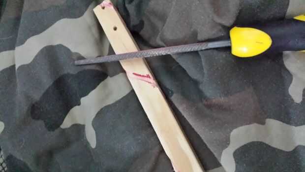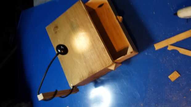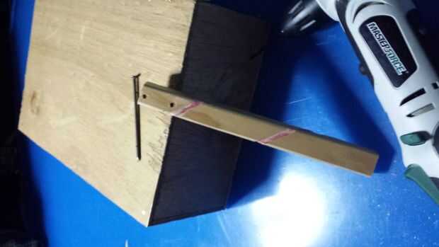 Ahora para el soporte de la luz toma la pieza larga de 1'' de 1'' por 1' de roble madera y perfore un agujero en un extremo de la misma. El agujero debe ser del mismo diámetro que el tornillo o clavo cualquiera uno su uso para asegurarlo. Luego necesitas hacer un agujero del mismo tamaño en uno de los lados después de que ate el pedazo de roble al lado de la caja y encontrar la manera de poner la luz en el poste. Usé un archivo para hacer un divit en la madera por lo que pude envolver alrededor de una luz.