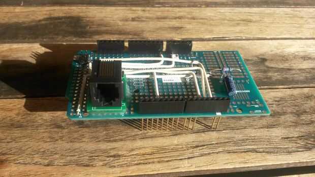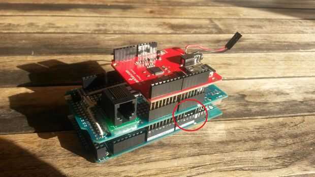 Observe el pin 11, 12 y 13 que se han cortado en el mega proto shield para que no se conecta a la Arduino más.