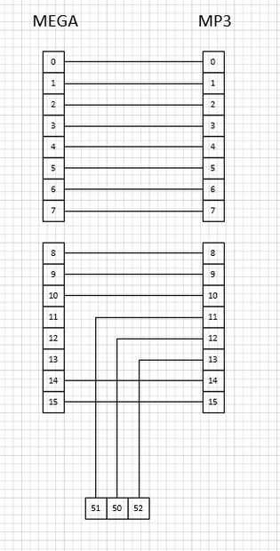 A la función con el Arduino MEGA, pins 11, 12 y 13 de la pantalla MP3 deben estar conectados con pin 50, 51 y 52 de la Arduino. Este cambio de pin se realiza en el mismo escudo de proto de mega que conecta con el anemómetro.