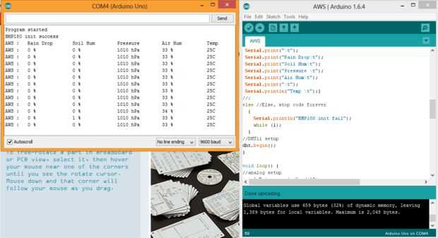 A continuación es el código de estación meteorológica de Arduino. Incluir la biblioteca de AWS_library.rar, subir el código a tu Arduino (mina Arduino Uno Rev3) y si no tiene problemas.