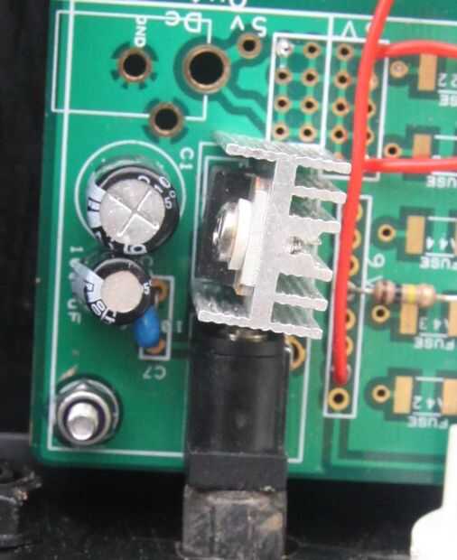 El componente principal es el bien ' ol regulador 7805 que es un circuito integrado compuesto por varios transistores y resistencias para llevar la tensión hasta una constante de 5,0 voltios desde cualquier lugar entre 8 y 35 voltios. Bien vale tener un rápido vistazo a la hoja de datos. Consigue bastante caliente por lo que un disipador de calor es esencial.