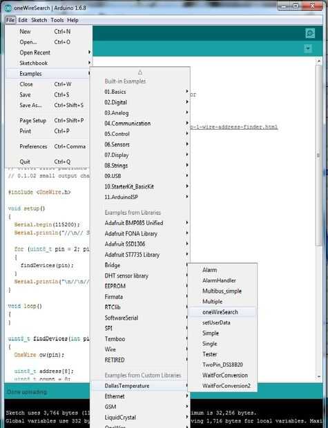El primer paso es ejecutar algún código en el Arduino a prueba el dispositivo y obtener la dirección del dispositivo. Para ello, debemos descargar e instalar las librerías y ejecutar uno de los dibujos de ejemplo de la biblioteca de Dallas, 'una búsqueda de alambre'.