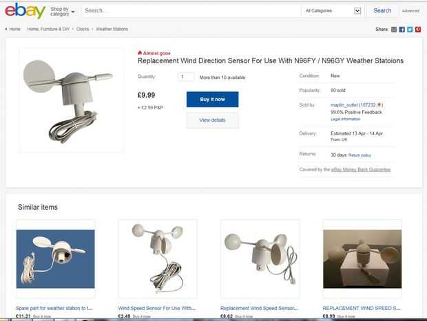 La velocidad del viento, sensores de viento dirección y pluviómetro utilizados originalmente fueron los genéricos utilizados en la mayoría de las estaciones meteorológicas más baratas disponibles. Son también los que Sparkfun vende en los Estados Unidos. He comprado mina de Maplin UK eBay.