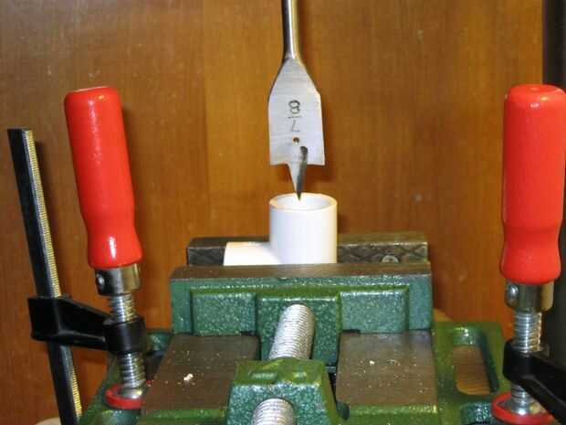 Solución: No recomiendo este método, pero esto es lo que hice. Primero había desmontado la Asamblea frialdad de viento excepto el rodamiento. Entonces sujeta la T en una prensa de tornillo. Todo lo que tenía era una espada 7/8 bits. Recomiendo utilizar lo que denomina un 7/8" Deming poco pero yo no tenía uno y no quería gastar el dinero para un tiempo de uso. Así que puse la punta de la pala en mi taladro y 'había centrado' la broca para que estaba en medio de la T de apertura. A continuación, sujeta el tornillo por lo que no podía moverse y cuidadosamente perforados la abertura a una profundidad de aproximadamente 0.45". El agujero no era muy aseado pero aceptar el potenciómetro.
