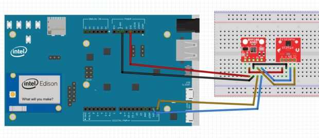 1. Conectar sensores a la placa y luego a la Edison según el diagrama adjuntada. No pude encontrar es decir la parte del módulo de GY-68 para Fritzing, pero las conexiones son casi lo mismo. Usted necesitará desactivar de enderezamiento en el módulo HTU21D de SparkFun como en GY-68 también existen y no son desmontables (por lo menos no fácilmente). Generalmente el principio es simple: energía, tierra y las líneas SCL y SDA de I2C + passthrough para el segundo módulo del sensor. Al final de esto tanto los módulos será en el mismo bus I2C de la Edison.