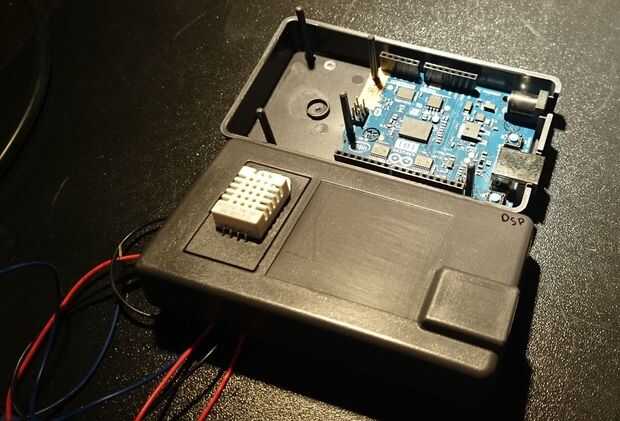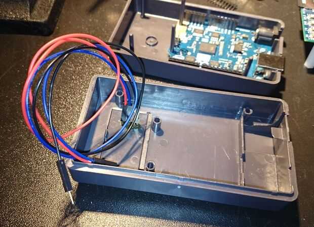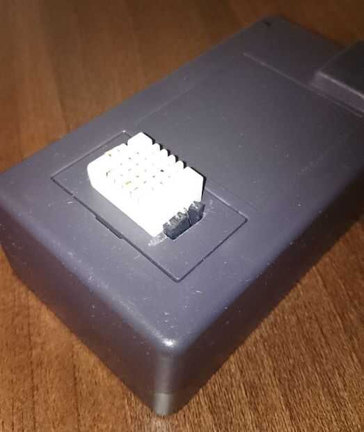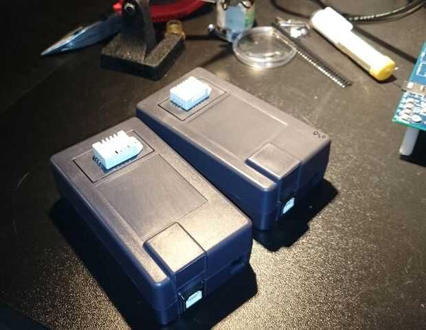 1. Hacer un recorte en la cubierta desmontable de la caja (diseñada para batería de 9V), así que usted puede poner los pernos del sensor en él mientras el sensor sí mismo sobre la cubierta. Usted necesitará los pernos del sensor de la curva a 90 grados para hacerlo. Como pueden ver en capturas de pantalla, primero traté de hacerlo por sólo agujeros por pin - pero teniendo en cuenta la longitud de los pernos y el espesor del recinto, que requería ampliar pernos del sensor para soldar pernos de extensión a ellos - que es una manera muy incómoda, porque el plástico se funde durante el proceso y se convierte en sucio. Última foto con un recinto muestra un enfoque diferente - yo sólo he molido un recorte mayor, para que la parte femenina del cable podría ir todo el camino. Es mucho más fácil de hacer y no parece mucho peor :)