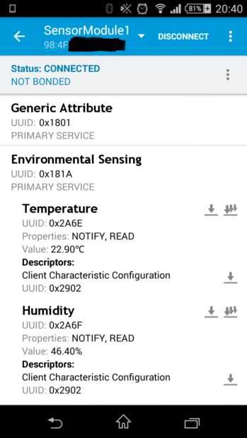 7. Después de podrá ver datos de módulo sensor a través de cualquier aplicación capaz de Bluetooth en el teléfono inteligente, por ejemplo, ésta que se muestra en la imagen. También hay un modo de depuración en el bosquejo, gestionado por definir - después de lo que le permite también será salida de datos del sensor para Monitor serie del IDE.