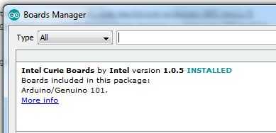 5. Descargar e instalar el IDE de Arduino de http://arduino.cc, en el soporte de Junta Manager Descargar pack para intel placas Curie (ver captura), una de las dos bibliotecas DHT que he probado instalar y cargar el módulo del sensor del bosquejo puede tomar desde mi repositorio de GitHub de proyecto estación de Edison
