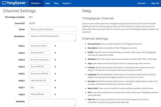 Simplemente vaya a thingspeak.com y hacer una cuenta. Rellene al menos el primer y segundo campo en la configuración. Si se conecta un sensor de temperatura y humedad tal como se describe en el paso siguiente, rellene 'temperatura' en el campo 1, campo 2 ' humedad' y 'rocío' en campo 3. Si desea conectar otros sensores como el sensor BMP, sensor de lluvia, LDR, simplemente hacer lo mismo para el resto de los campos.