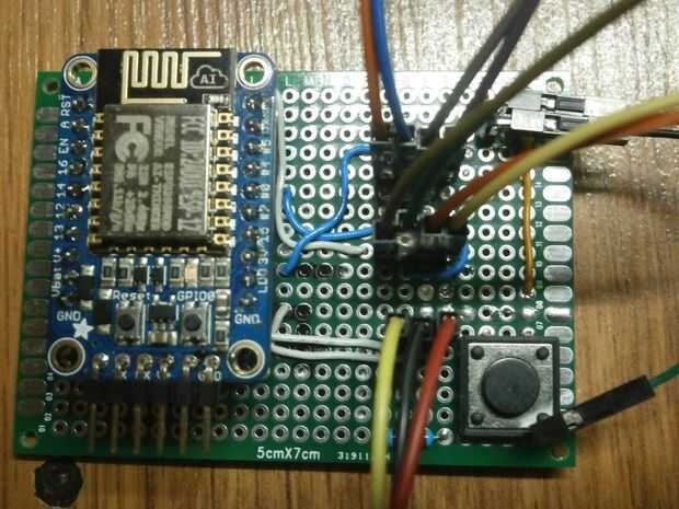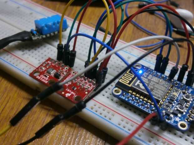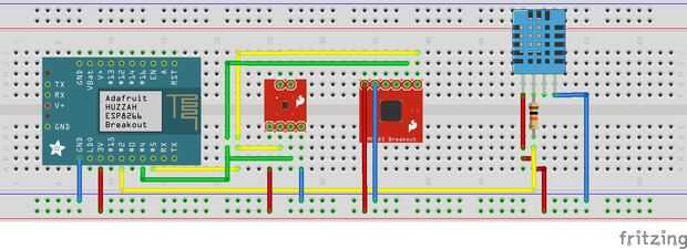Hacerlo con la ayuda de la Junta de creación de prototipos. Conecte los pines SDA y SCK de los sensores de TMP102 y BMP180 a los pines 5 y 4 (como en Arduino UNO) del módulo HUZZAH y el sensor de la DHT a pin 2. GND a GND en el tablero y la entrada de alimentación de los sensores con conector de V + 3 de la Junta HUZZAH. Si quieres poner un botón de reset de hardware así que puede restablecer la Junta. También agregar un conector de la batería así que usted puede alimentar con una batería como yo. También tienes que poner un puente entre el pin 16 y primero del Comité HUZZAH para despertar la Junta.