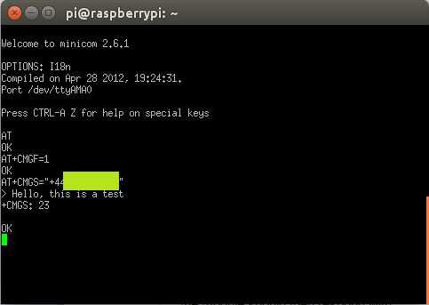 El módem con responder con ">" después de que se puede escribir mensaje de usted. Para enviar la prensa mensaje < CTRL-Z >. Eso es todo, y con suerte que solo ha recibido un texto directamente desde la el Raspberry Pi.