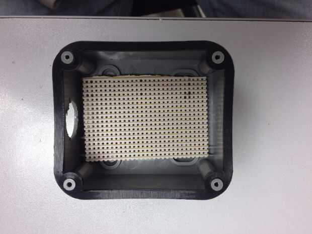 Usted tendrá que romper la protoboard para caber dentro de la más pequeña de las dos cajas de conexiones. Esto es donde se encuentra el circuito de detección. El circuito de detección se transfiere ahora desde el protoboard a la protoboard. Ahora tendrás que hacer alguna soldadura. Asegúrese de que usted está cómodo con el uso de un soldador de forma segura. Si no está seguro, pida la ayuda de alguien que es un LG competente.