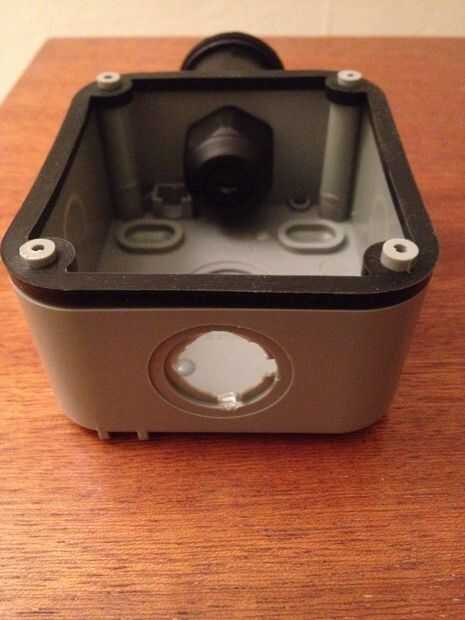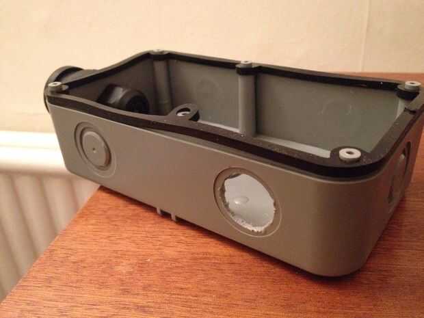 Primero noquear a un agujero en cada caja para la conexión entre los dos, como se ve en las fotos. Golpeando hacia fuera los agujeros puede ser complicado hacerlo perfectamente, pero no importa un borde áspero. He encontrado que el mejor método es utilizar un destornillador a pierce primera el anillo dentado alrededor de cada agujero, y luego lo levante como una tapa de lata de pintura. El conector resistente al agua entonces se utiliza para conectar las dos cajas.