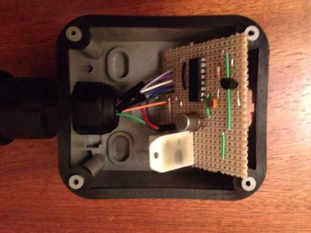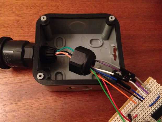 Luego pasar a la unidad de sensora. En la foto, de arriba a abajo, los cables son; gris, blanco, morado y azul son las líneas de datos SPI, negro es tierra, naranja es 3.3V, 5V es rojo y verde es 4 GPIO. Usted necesitará encontrar los cables de puente para conectar a estos y luego alimentarlos a través del conector de cable impermeable como se ve en las fotografías. Entonces el correspondiente GPIO puede conectarse cada cable y el conector puede ser reforzado. En esta etapa es fácil ver cómo podría mejorarse el diseño; la LDR no va a estar expuesto a una gran cantidad de luz (aunque todavía puede ser útil conocer los valores relativos, y golpeando hacia fuera un agujero adicional podría ayudar), creo que sería mejor utilizar el mismo tamaño como la caja de la unidad informática de la unidad de sensora también, entonces sería más fácil encajar la placa de circuito en la caja y habría espacio para jugar con diferentes arreglos.