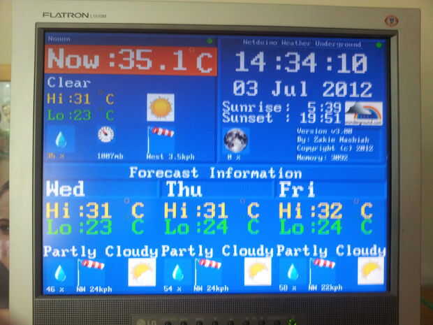 La salida es gráfica con iconos y algunos colores texto y codificación según tiempo y temperatura de color. Es uno de esos gadgets que quería tener desde hace tiempo, una pantalla de predicción meteorológica que existe sólo como el reloj de pared. Sí sé que tienes cosas de aspecto más agradables en su máquina de angry birds... Simplemente me gusta hacerlo yo mismo.