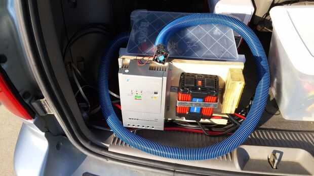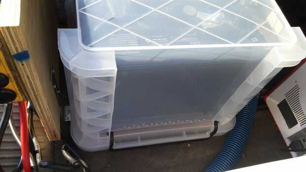 Para ventear el gas de hidrógeno fuera del coche, he añadido la manguera azul a la caja de archivo. Usando cinta adhesiva para añadir un ventilador pequeño en el extremo de la manguera para extraer el hidrógeno de la caja. Hidrógeno es más ligero que el aire así el archivo caja, boca abajo, debe capturar cualquier hidrógeno donde pueden eliminarse a través de la manguera. Aún no he añadido un respiradero confiable a la furgoneta pero es una mejora futura. Ahora estoy ventilando el gas hacia fuera la ventana lateral.