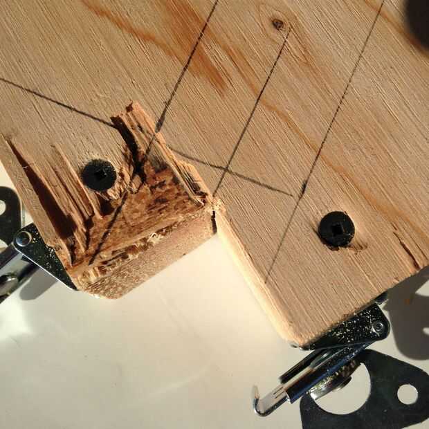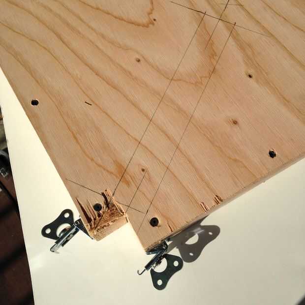 - Montar los pasadores en el panel de base para que ellos la esquina cortada de la proyección como se muestra en la foto. En esta etapa, colocación exacta no es importante - encuentra los seguros para que sus extremos alejados estaban cerca de la mitad de la esquina cortada.